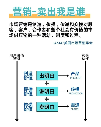 2. 营销:旨在“卖出我是谁”,是创造、传播、传递和交换有价值市场供应物的过程。通过创造、传播、传递价值,对应产品、传播、渠道等营销动作来推动产品销售。