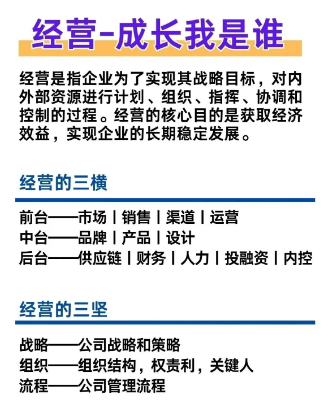 5. 经营:追求“成长我是谁”,是企业对内外资源计划、组织等以获取经济效益和长期发展的过程。包含前台、中台、后台“三横”,以及战略、组织、流程“三坚”。