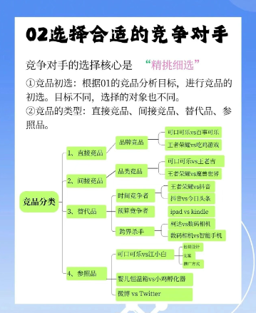 核心是“精挑细选”。依据分析目标初选,竞品类型分直接竞品、间接竞品、替代品、参照品,目标不同,所选对象不同。
