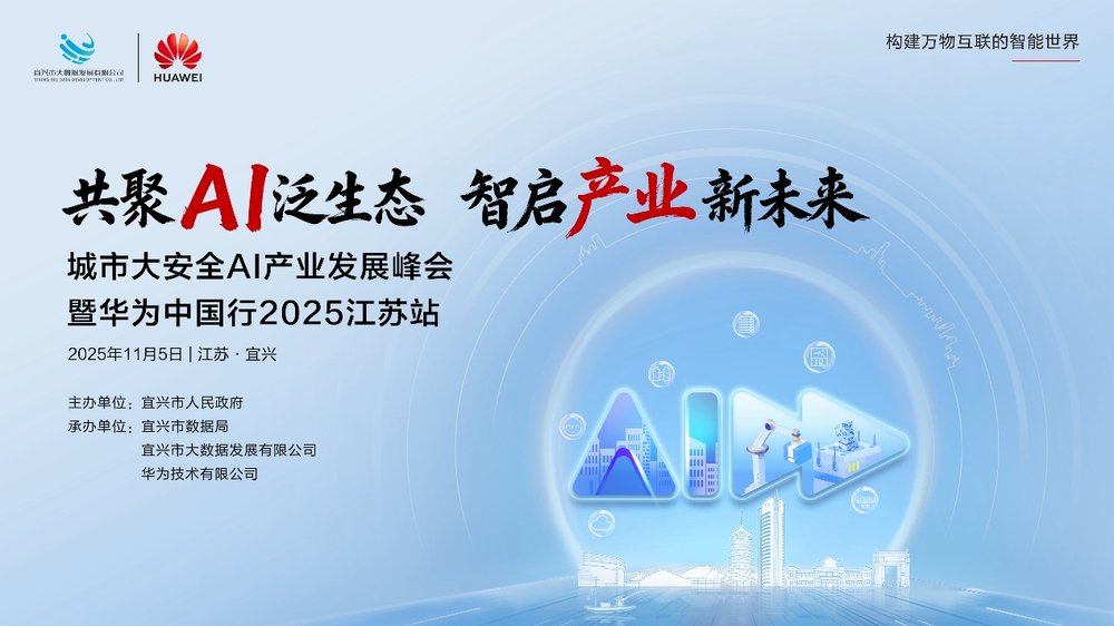 当前,数字中国建设迈向提质、提速、提新的新质生产力时代,人工智能正成为推动城市现代化与产业升级的核心引擎之一。为深入探讨AI技术如何赋能城市安全战略、推动产业高质量发展,11月5由宜兴市人民政府主办,宜兴市数据局、宜兴市大数据发展有限公司、华为技术有限公司联合承办的“共聚AI泛生态 智启产业新未来——城市大安全AI产业发展峰会暨华为中国行2025江苏站”活动将于江苏宜兴正式举办。