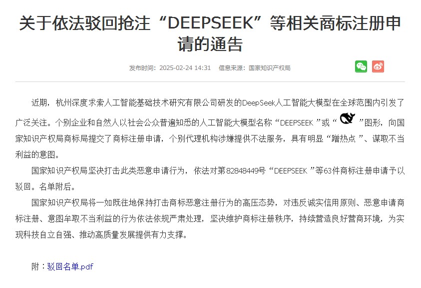 国家知识产权局坚决打击此类恶意申请行为,依法对第82848449号“DEEPSEEK”等63件商标注册申请予以驳回。名单附后。