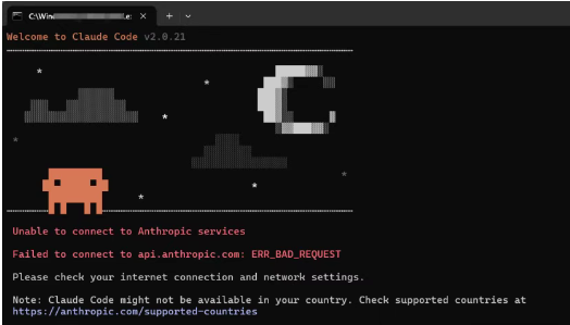 现在高阶玩家玩的是claude,但claudeCode对国内用户很不友好,如果你不会些特殊的手段,即使安装了claude也会像我这样: