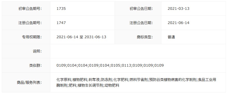 商品服务:化学原料;植物肥料;刹车液;防冻剂;化学肥料;燃料节省剂;预防谷类植物病害的化学制剂;食品工业用酶制剂;肥料;植物生长调节剂;动物肥料