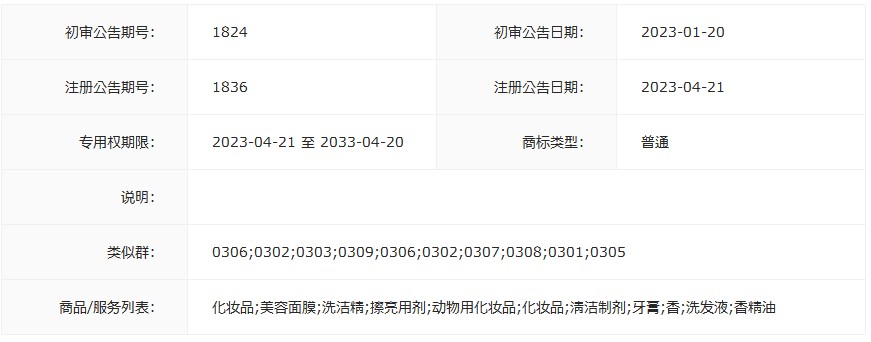 商品服务:化妆品;美容面膜;洗洁精;擦亮用剂;动物用化妆品;化妆品;清洁制剂;牙膏;香;洗发液;香精油